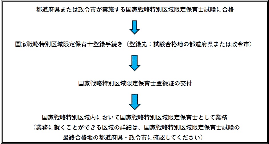 「国家戦略特別区域限定保育士」として業務に就くには、国家戦略特別区域限定保育士試験に合格後、合格地の都道府県知事または政令市長に対し登録手続きを行い、その業務に就く前に「国家戦略特別区域限定保育士登録証」の交付を受ける必要があります。